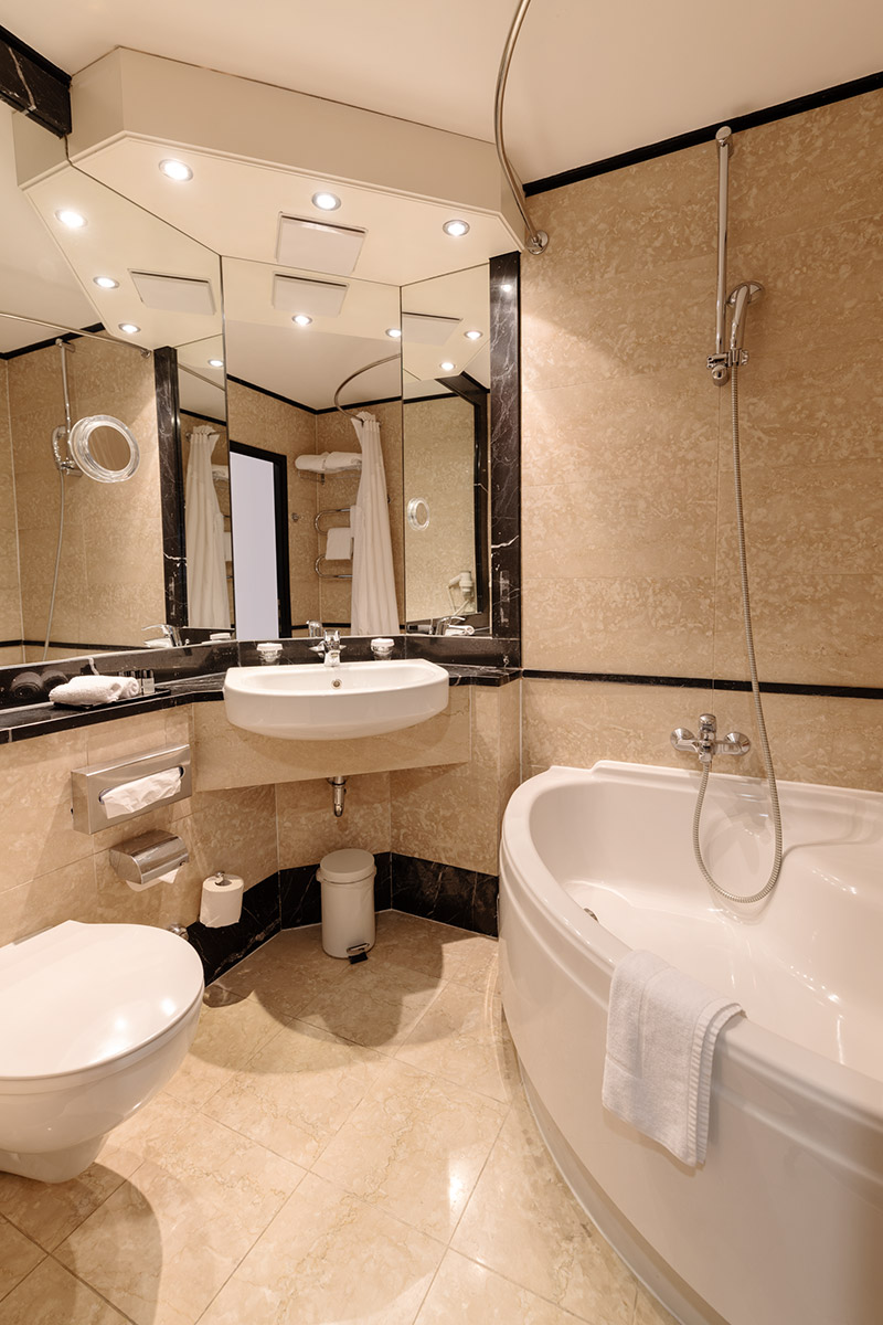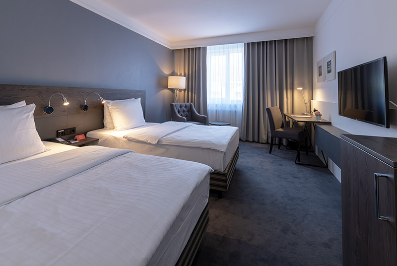Our 101 modern, light-filled hotel rooms with large windows and floor-to-ceiling wall mirrors are decorated with warm colors. TVs with satellite channels, electric kettles, and minibars provide home-like comforts, and work desks with free Wi-Fi.